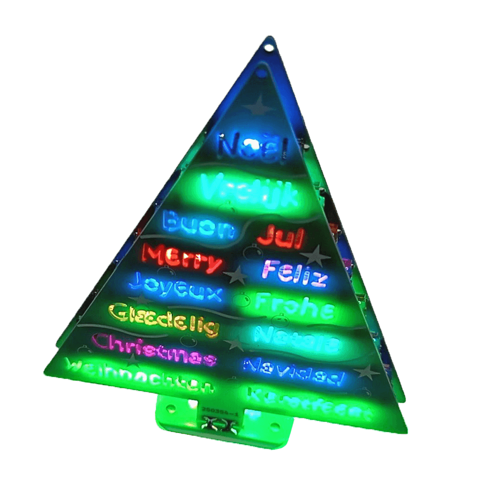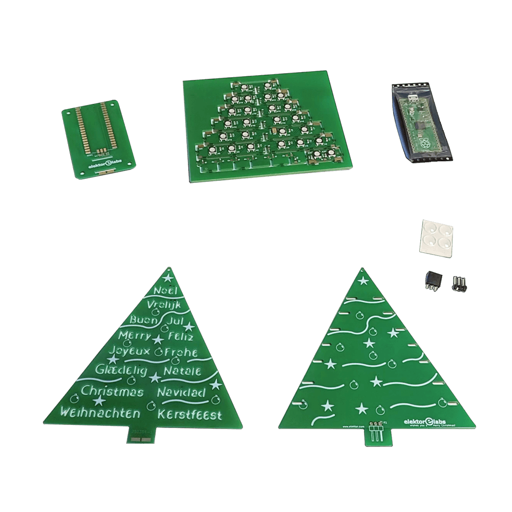 Geef de feestdagen een vleugje technische magie met de woordrijke kerstboom, een unieke doe-het-zelf elektronicakit ontworpen door Elektor. Deze prachtig ontworpen 3D-kerstboom combineert elf printplaten, een Raspberry Pi Pico en 27 adresseerbare RGB-LED's om kerstgroeten in zeven talen te verlichten: Deens, Nederlands, Engels, Frans, Duits, Italiaans en Spaans.