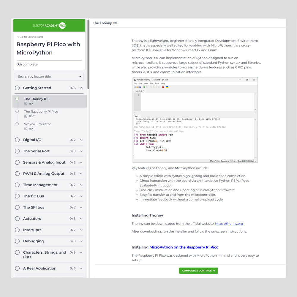 Deze complete microcontroller-programmeercursus op basis van de Raspberry Pi Pico bevat een leerboek, een componentenkit, praktische projecten en een uitgebreide online cursus met simulaties. Ideaal om embedded systems stap voor stap te leren programmeren in MicroPython via een praktische hands-on aanpak.